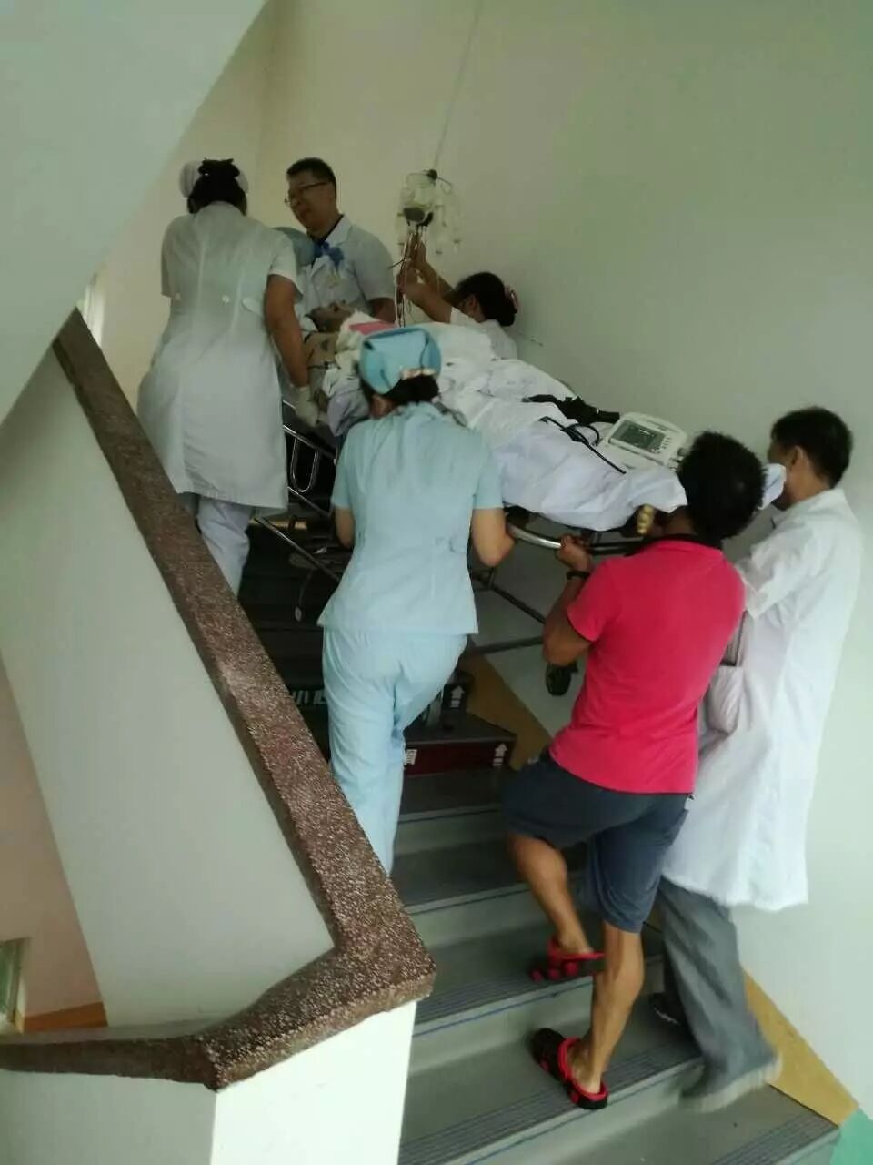 (电梯停运,大家齐心协力把转运床抬上楼梯)