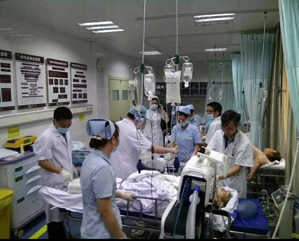 13:00 ,风势减弱,陆续增多的病人很快把急诊科围得水泄不通。在外伤急诊患者不断增加的情况下,除了院内协调的支援医生,在家休假的医生、护士主动来院增援。“我们的心都很急,但风太大,我们不敢冒然出来,保住命,才能救更多的患者,夹着两次风雨间隙,雨势减弱,我们果断出来!”这是主动回到医院的EICU张伙新医生的话。你若性命相托,我必全力以赴!另一个完成“铁人三项”的是急诊科刘华裕医生,才结束24小时工作的他,简单洗了把脸,继续投入抢救,36小时的坚守,直至急诊科回复往日的节奏。